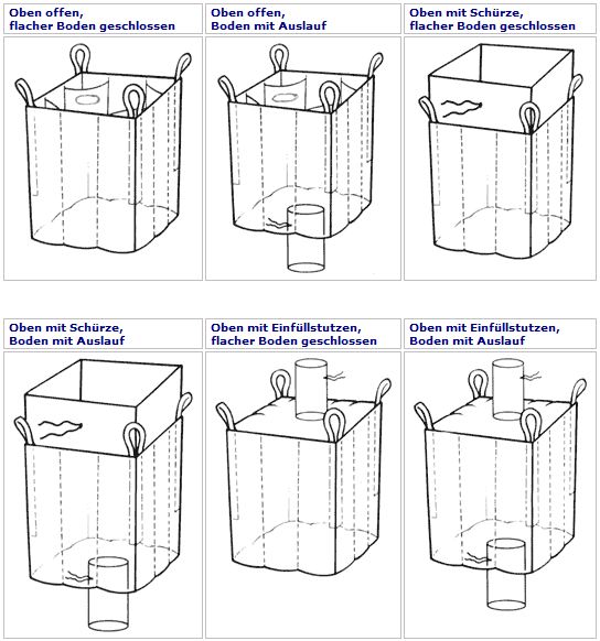 Q-Bags sparen ca. 20% an Stellfläche gegenüber normalen Big Bags. Mit 4 Gurtschlaufen zum Heben und Transportieren. Es gibt eine luftdurchlässige Ausführung aus unbeschichtetem Gewebe und eine staubdichte Ausführung aus beschichteten Gewebe mit speziellen Nahtabdichtungen. Der Boden kann quadratisch oder rechteckig sein. Oben kann der Q-Bag offen, mit einer Schürze oder mit einem Deckel mit Einlauf versehen sein. Der Sackboden ist entweder geschlossen oder mit einem Auslauf ausgestattet. Auf Wunsch wird der Q-Bag bedruckt und mit einer Dokumententasche versehen. |