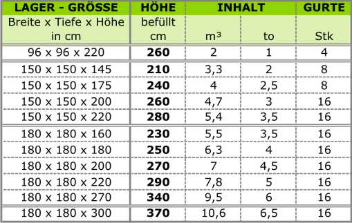 Wir fertigen Sackbreiten von 96cm bis zu 225cm und Silos von 1m³ bis zu 15m³ Inhalt.
