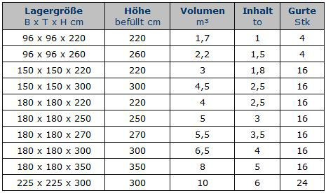 Wir fertigen Sackbreiten von 96cm bis zu 225cm und Silos von 1m³ bis zu 15m³ Inhalt. |